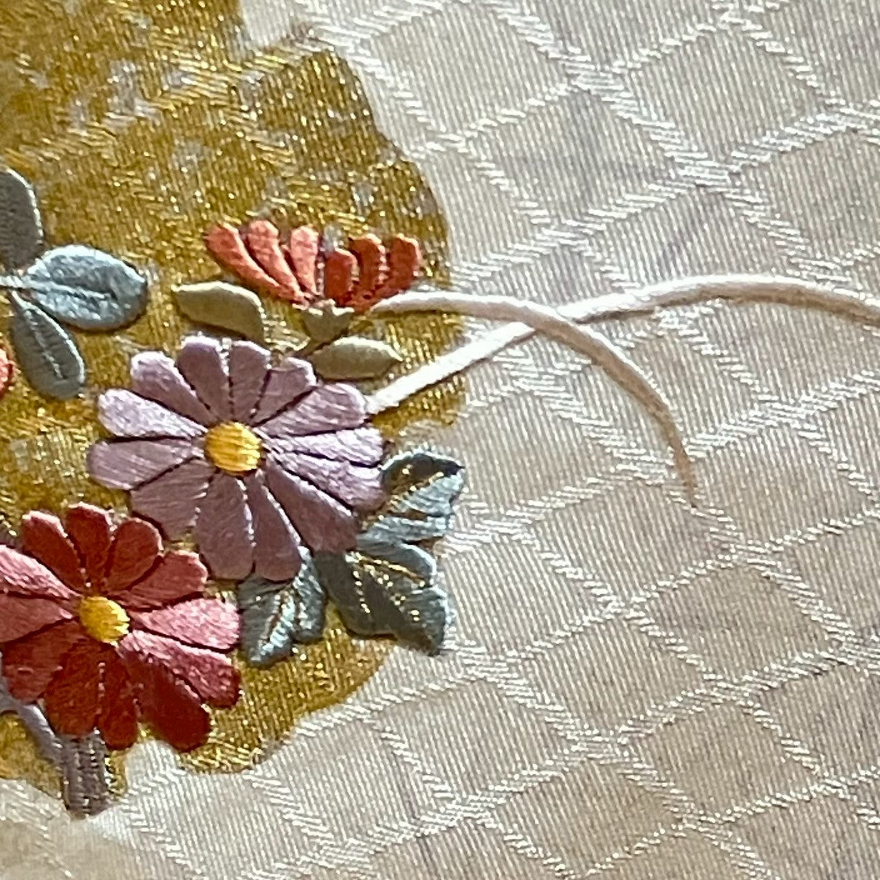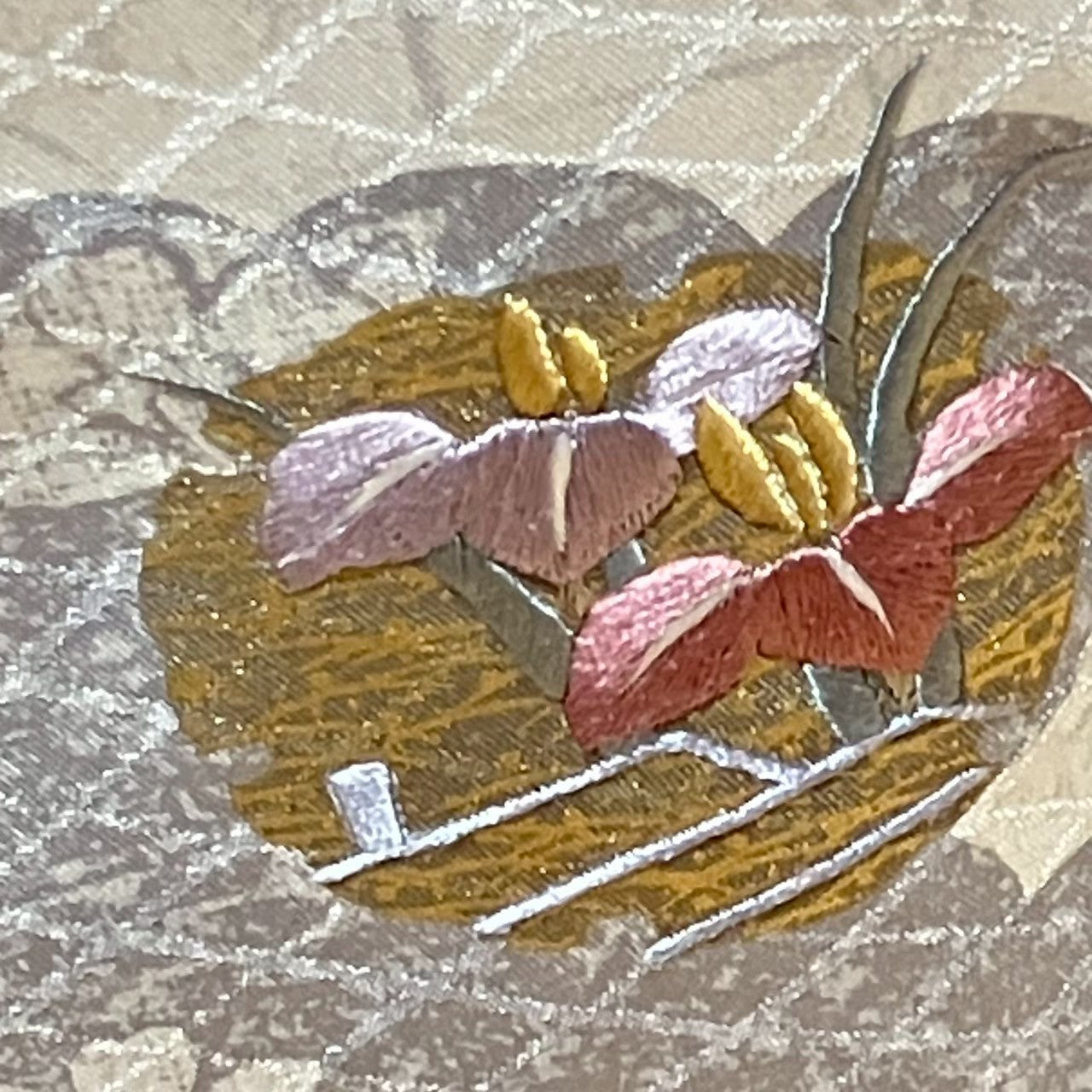 This is a visiting kimono featuring a snowflake pattern with gold and silver accents.