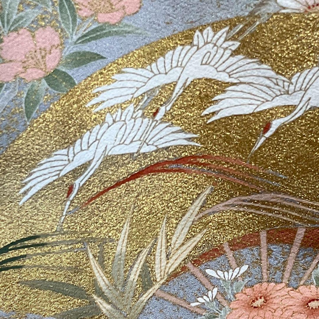 It is a color tomesode with crane design, gold coloring, and three crests.