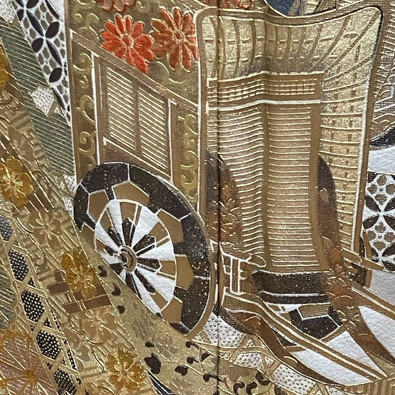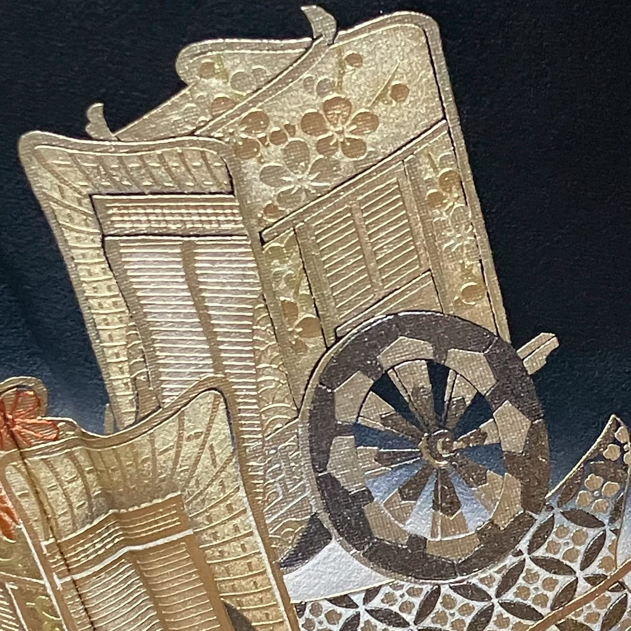 It is a black tomesode with car and flower design and gold and silver coloring.