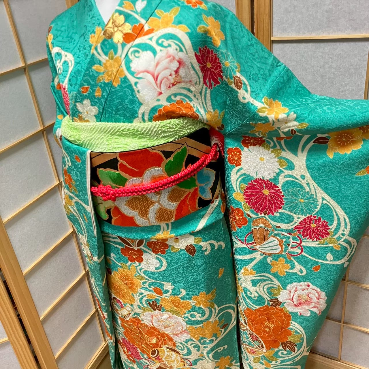 This 4-piece set includes a furisode, obi, obijime, and obiage!