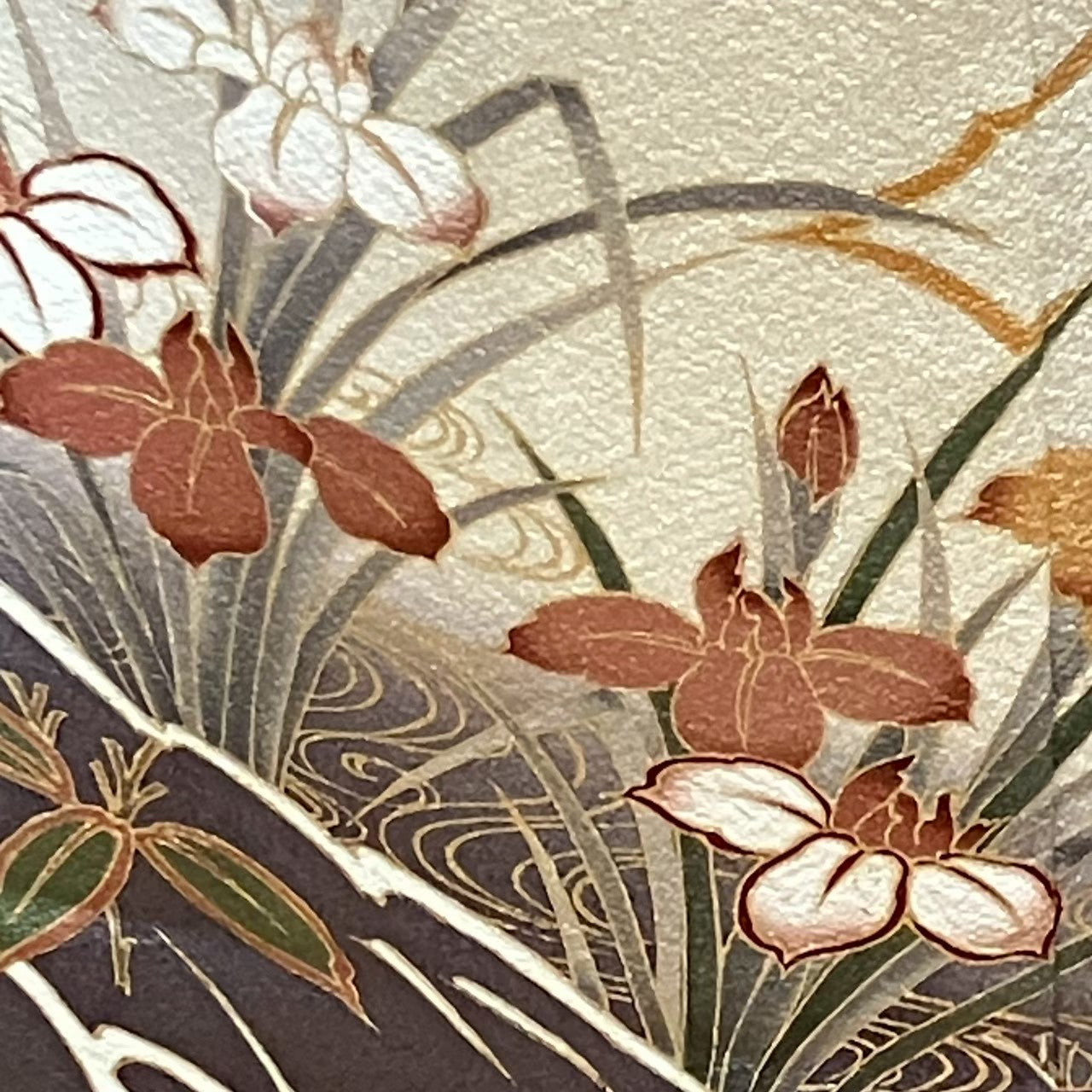 It is a colored tomesode with a floral design, gold coloring, and five crests.