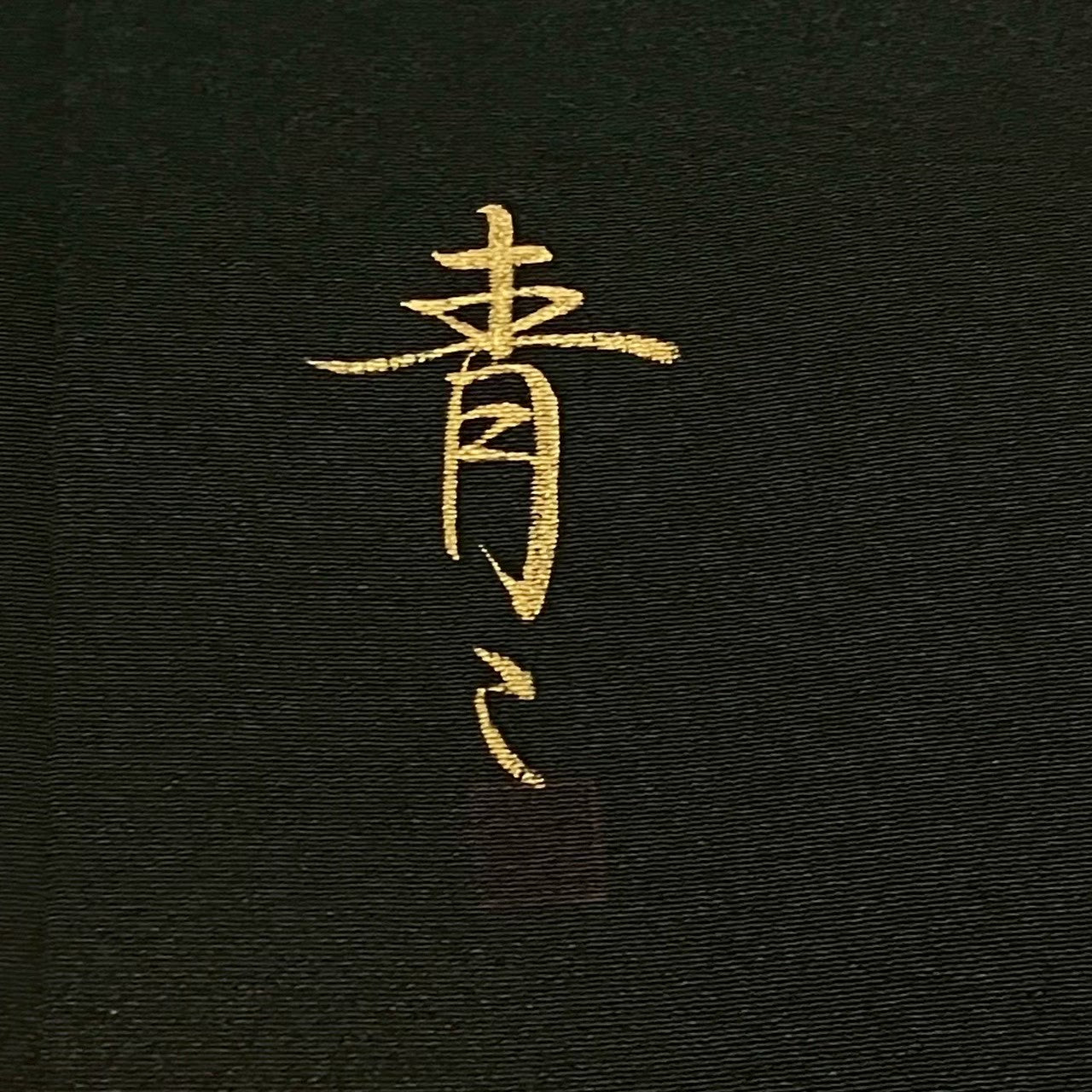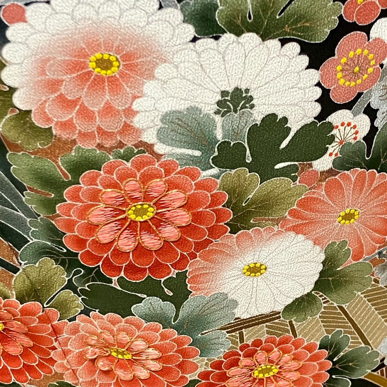 This is a black tomesode with flower and car design, embroidery, and gold color.