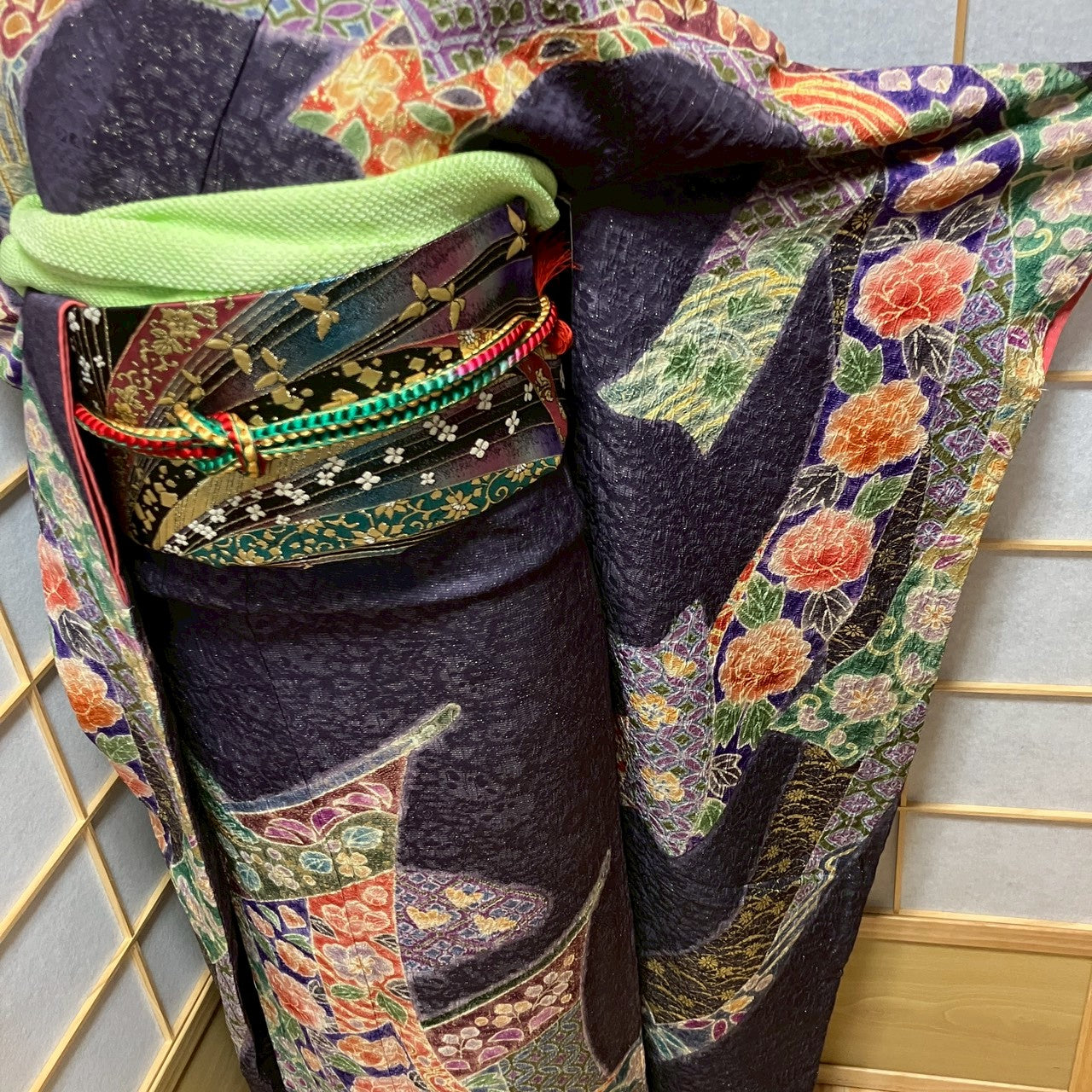 6132# Japanese Vintage Furisode Kimono Obi Obijime Obiage 4-Piece Set Silk Robe