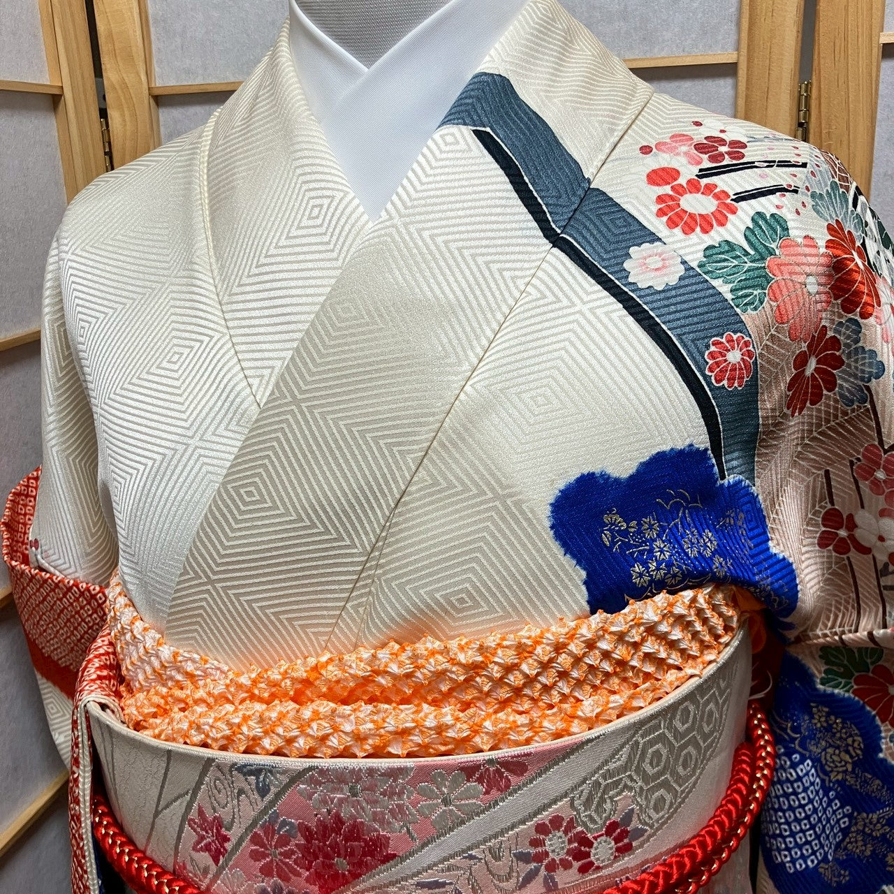 This 4-piece set includes a furisode (long-sleeved kimono), obi sash, and obiage!