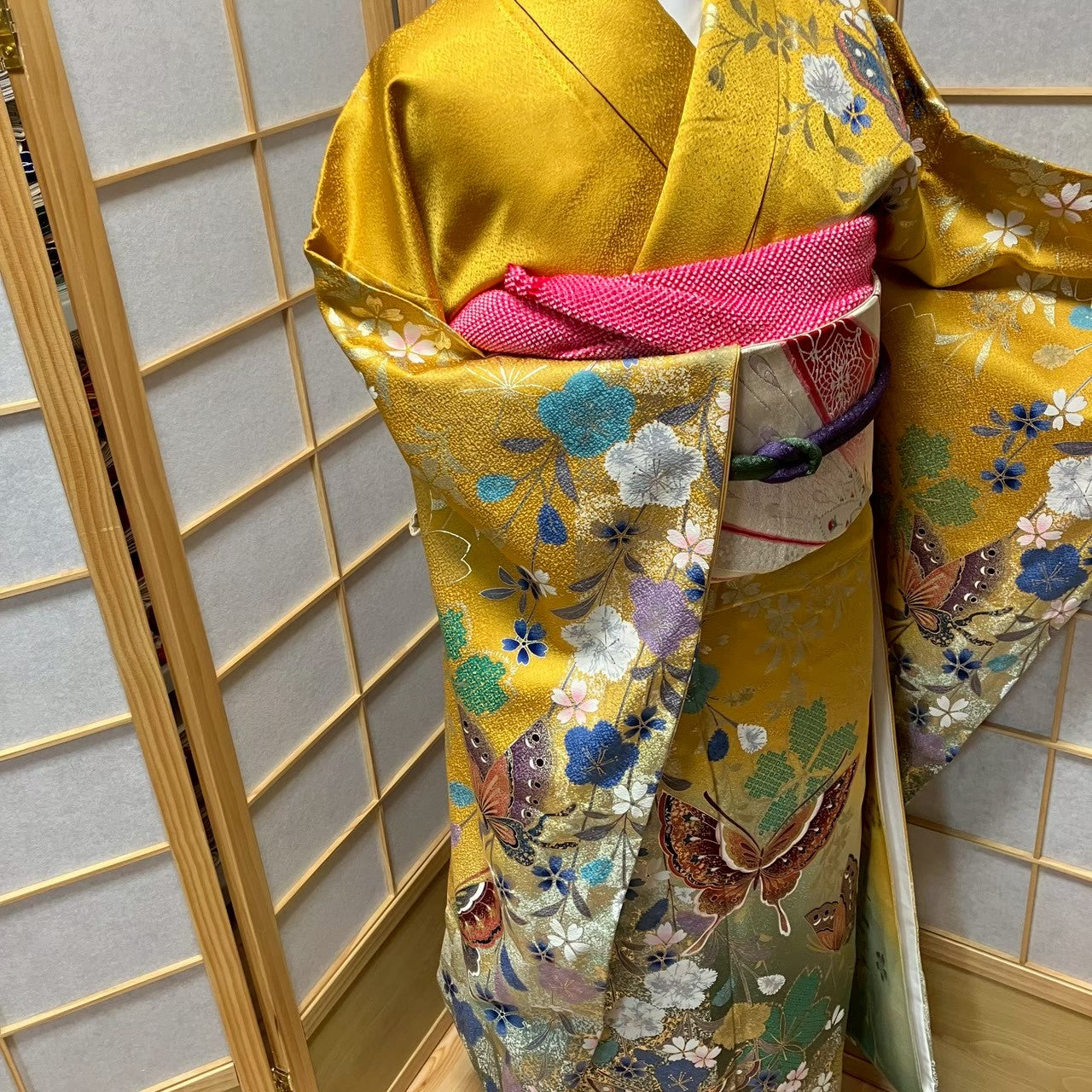 A furisode featuring a floral and butterfly pattern with gold accents.