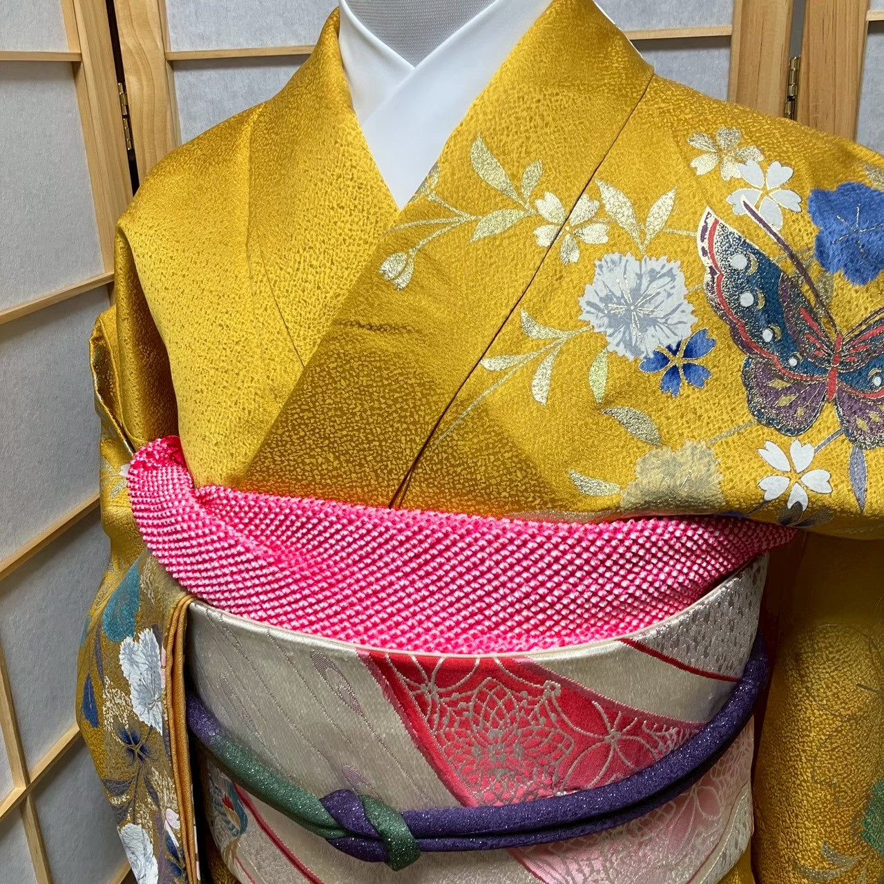 7470# Japanese Vintage Furisode Kimono Obi Obijime Obiage 4-Piece Set Silk Robe