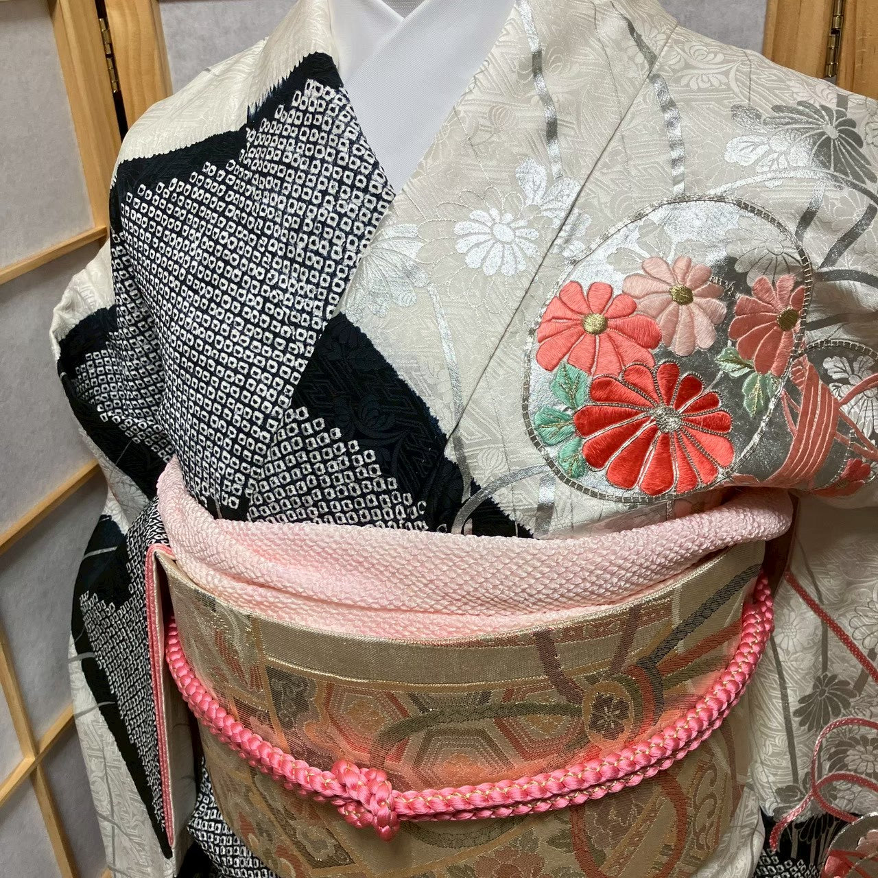7500# Japanese Vintage Furisode Kimono Obi Obijime Obiage 4-Piece Set Silk Robe