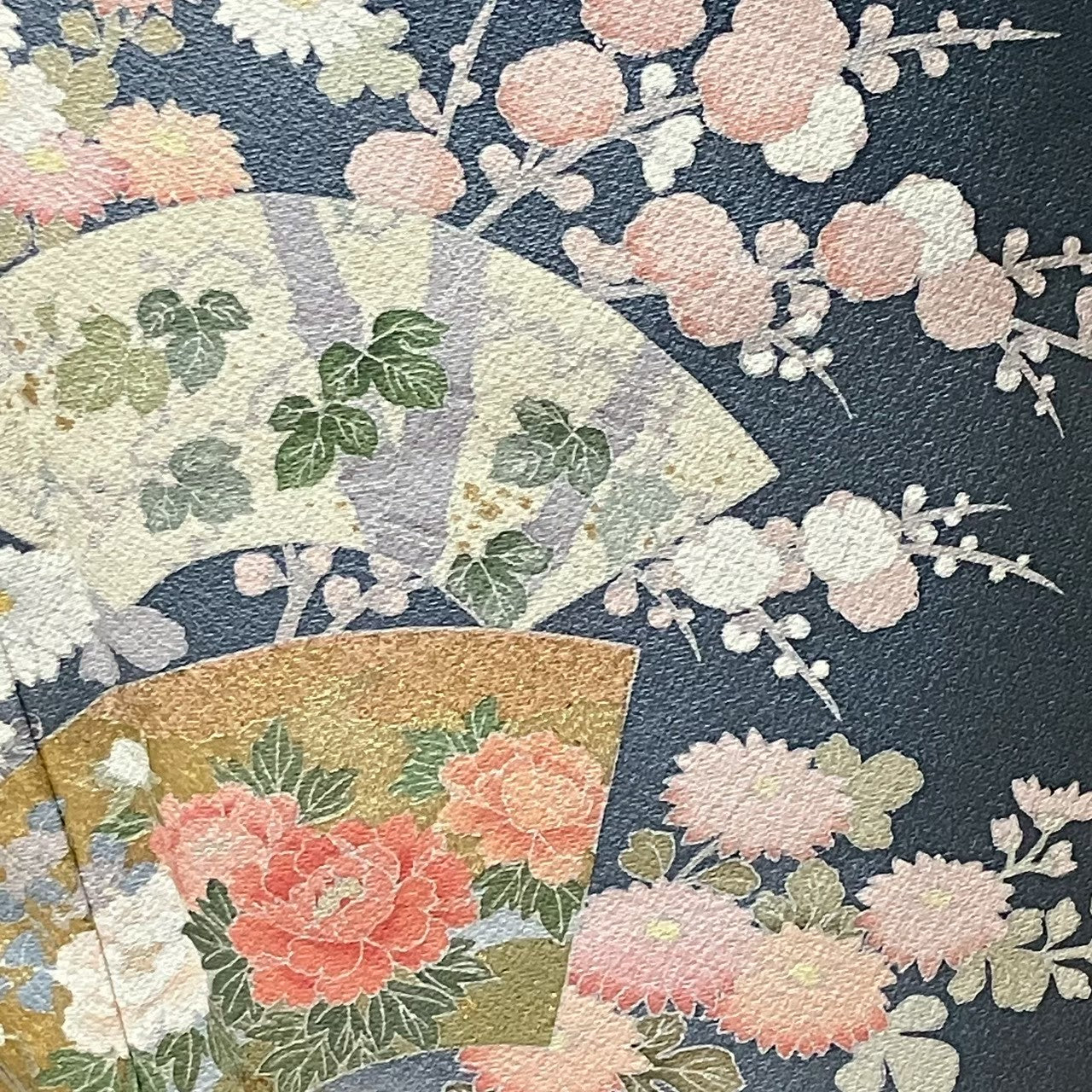 This is a visiting kimono featuring a fan-shaped floral pattern with gold accents.