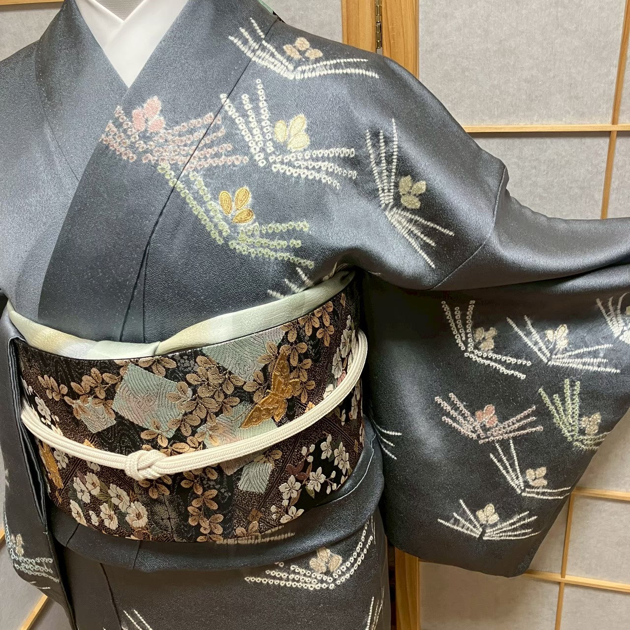 This is an embroidered and shibori-dyed visiting kimono.
